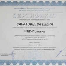 1) "НЛП-Практик", 2012, Институт НЛП, сертифицированный курс под руководством Юрия Чекчурина и Михаила Пелехатого.